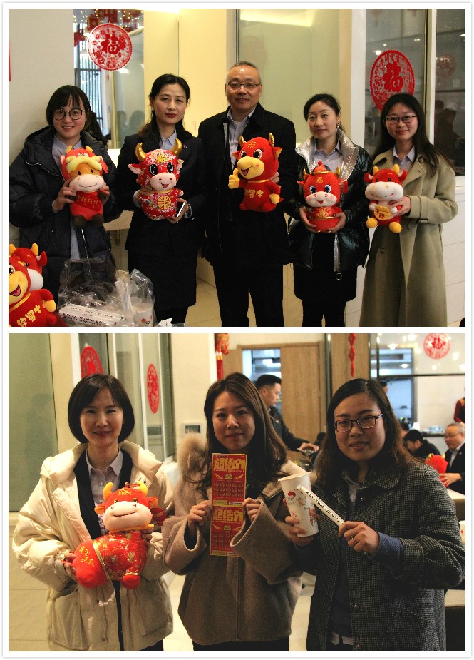 其實(shí),早在中午的時(shí)候,員工們就收到了另一份驚喜——趣味抽盲盒。精美的盲盒里藏著幸運(yùn),藏著喜悅,也藏著祝福?!拔页榈搅四滩琛薄拔页橹辛瞬势币粡垺薄拔乙仓歇劻?,哇,是我最喜歡的牛氣沖天玩偶”“我最愛吃的徽面醬套餐抵用券,今年一定是我的幸運(yùn)年”……每一位參與的員工,都有禮品相送。最有意思的是刮彩票,大家湊在一起,眼睛盯著彩票,每刮中一個(gè),頓時(shí)爆出陣陣喝彩聲,活動現(xiàn)場熱鬧非凡。